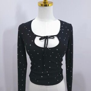 Celestial-inspired long sleeve top features a delicate white star print over a classic black ribbed knit. The scoop neckline is accented with a trendy keyhole cutout and a self-tie bow detail, adding a touch of feminine charm. Designed with a slightly cropped hem and a slim fit, this versatile piece transitions easily from casual daytime wear to a cozy loungewear staple.