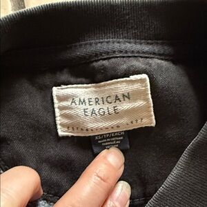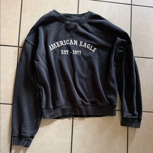 Stylish off-the-shoulder sweater. Features bold American Eagle logo. Comfortable and trendy.