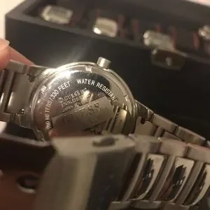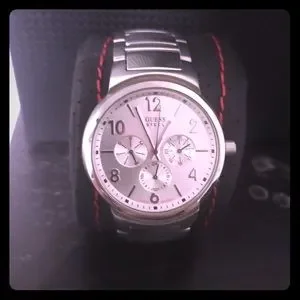 Preowned mens Guess Steel watch. Water resistant 100 meters. Clean with no viable scratches. Just needs a battery and good to go