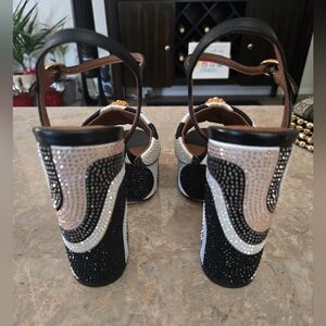 Known for its bold aesthetic, this specific version features a black and bone swirl pattern completely embellished with shimmering rhinestones. It's topped with the brand's signature brushed gold eagle head on the toe strap.