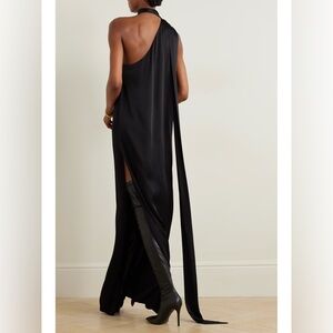 Chic black satin evening gown with a one-shoulder design and scarf. Perfect for formal or black tie weddings. Hemmed to fit 5’8” with 5 inch heels.
