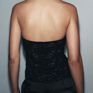 Strapless corset with underwire and bare shoulders. Featuring lace and velvet details. Fastening with an invisible zip in the seam.