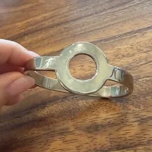 Modernist geometric bangle bracelet featuring a minimalist open circle design. Silver-tone metal construction with hinged closure for easy wear. The sculptural circular focal element gives the bracelet a clean architectural look that pairs well with Scandinavian, minimalist, or contemporary styles.