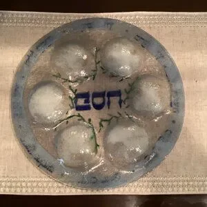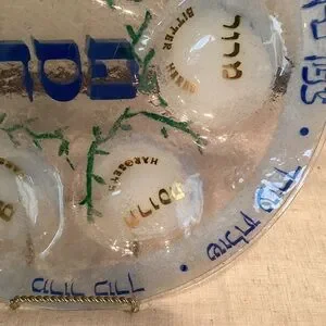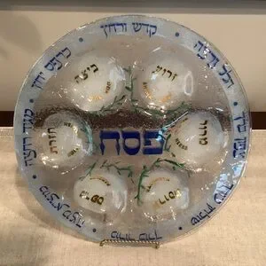 Handcrafted Elegant Glass Seder Plate w/Blue & Gold handpainted symbols, 1980’s