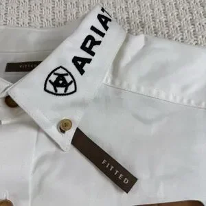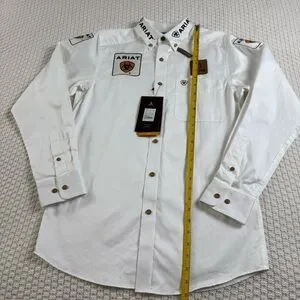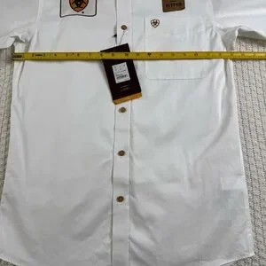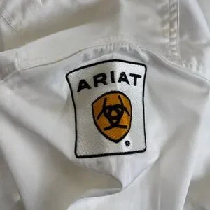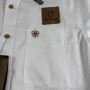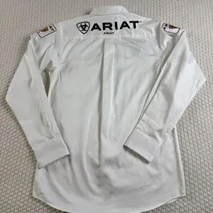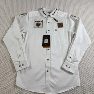 Stylish white shirt with button-down design. Features Ariat logo details. Ideal for casual wear. New with tags. DISCONTINUED MODEL