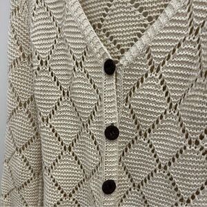 Elevate your wardrobe with this elegant cream open-knit cardigan. Perfect for adding a touch of sophistication to any outfit. Super lightweight and perfect for the spring. Buttons are brown and detailed. Design is a diamond pattern.