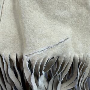 Chic camel leather jacket with fringe accents. Ideal for casual wear. Tag says XL but fits more like an L. This jacket is super cute and in excellent condition. Hard to find fringe on the cuffs.