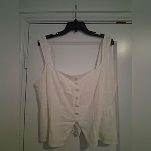 Stylish cream linen crop tank top. Features button front. Perfect for formal, business, or casual wear.