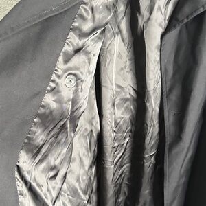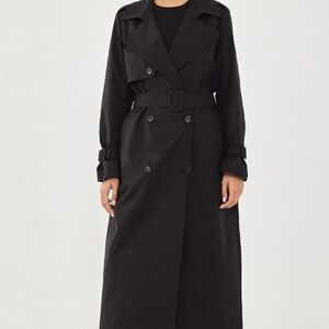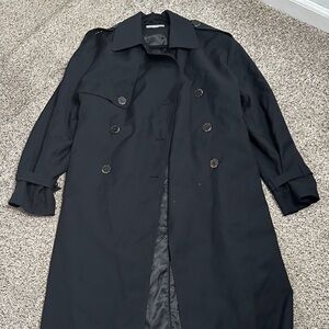 Stylish black trench coat with button details and a waist tie.size tags missing please see measurements great condition pit to pit 22 inches length 43 inches