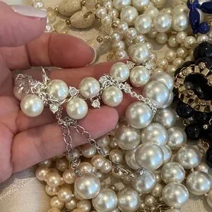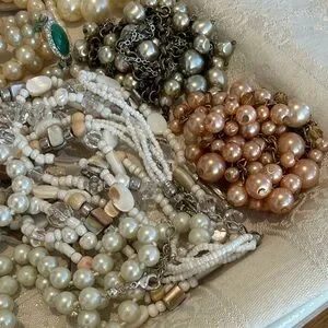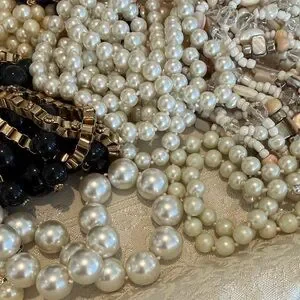 A stunning collection of pearl and bead jewelry. Features white, cream, and blue tones. Perfect for adding elegance to any outfit.