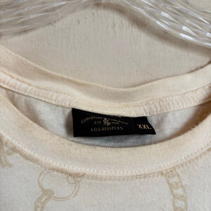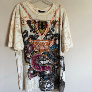 Super rare, pre-owned Christian Audigier men's short-sleeve t-shirt in beige, size XXL. The shirt features a vibrant, multicolor graphic design on the front, including snakes, chains, and a central emblem with "CHRISTIAN AUDIGIER EST. 1958 LOS ANGELES." The back displays a large black and white snake graphic with "Charmed Life" text, and the brand name. Some areas of the design, particularly the chains and text, have a metallic copper-colored finish. Measurements indicate a pit-to-pit width of 25 inches and a length of 31 inches. This shirt is from the early 2000s and has some darkening around the neckline and some print transfer on the chest (pictured). This is from the same brand that designs Ed Hardy