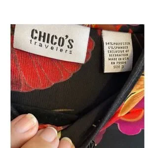 The colorful floral pattern with red, pink, coral, and gold tones gives the blouse a striking artistic look while the stretch fabric provides comfortable wear and easy care. Part of the Chico's Travelers line, known for wrinkle-resistant fabric and versatile travel-ready style.