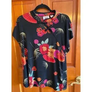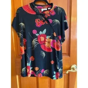 Beautiful **Chico's Travelers collection blouse featuring a vibrant Asian-inspired floral print on a classic black background. This top has a distinctive mandarin collar with decorative frog closures and an elegant wrap-style neckline that creates a flattering drape.