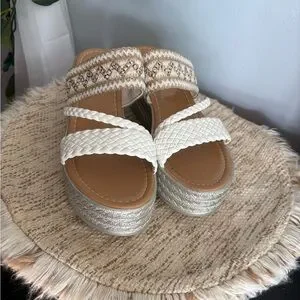 Step into style with these chic braided wedge sandals. Featuring a comfortable design, these cream and tan sandals are perfect for any occasion.