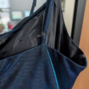 Chic black bodice with flowing blue shimmer skirt. great for prom.