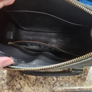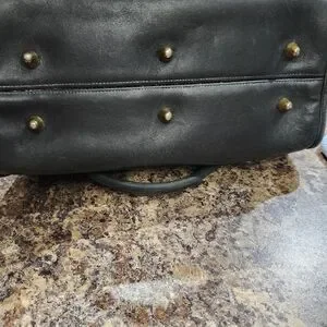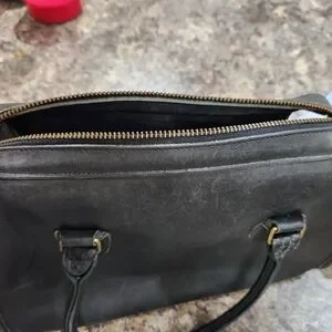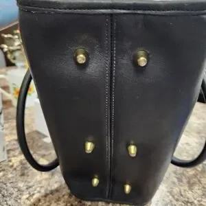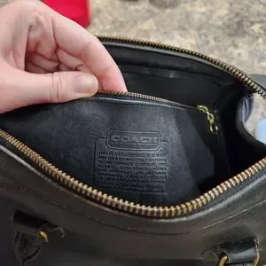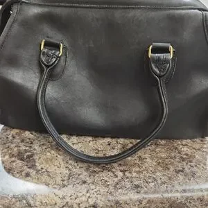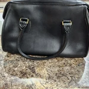 Vintage and elegant black leather bag by Coach. Features gold accents and zipper. Ideal for daily use.