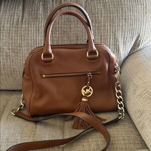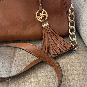 Chic Michael Kors satchel in medium brown leather. Features gold accents and a stylish tassel. Perfect for any occasion. Comes from a smoke free pet free home. Nice clean bag studded bottom