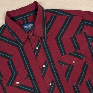 Pre-owned Wrangler Western short sleeve snap-front shirt in clean, wearable condition with light general wear from prior use and laundering. Fabric is clean and intact with even color, no stains, holes, or damage, and light wrinkling from storage and handling. Collar, snap front, pockets, hems, and seams are complete and functional.