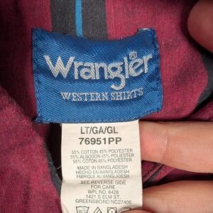 Label details: Neck label reads "Wrangler Western Shirts"; interior tag lists size LT/GA/GL, style 76951 PP, 55% cotton 45% polyester, made in Bangladesh, and WPL 6428.