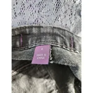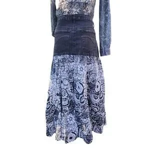 Gloria Vanderbilt Gray Dark Wash Distressed Denim Black White Paisley Floral Cotton Peasant Reconstructed Upcycled Midi Skirt. Precious flowy whimsical skirt. This skirt features pockets that are bejeweled and a front zipper + button in front.