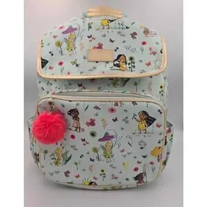 This is a Disney Animators Collection Mint Green Princesses Backpack. This is a large backpack that will hold everything you need. It has a large main compartment with a flap closure, front zippered pocket, side pockets, an adjustable shoulder strap, and a cute pink pom pom charm on the front zipper. I have included an AI model of hwo it may look when wearing.