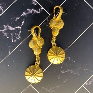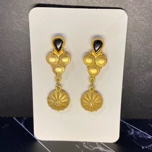 Stunning vintage earrings from the Jonette Jewelry Company with a hammered gold finish that is often seen in their Artifacts lines from the 80s. They feature a teardrop-shaped black stone set in “gold” with a dangling sunburst or urchin motif. ‘JJ’ trademark stamped on the back. Very nice condition. From my mother-in-law’s estate.