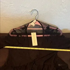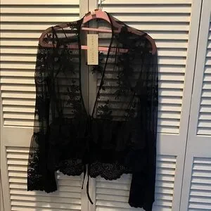 Elegant black sheer lace top with floral details. Perfect for layering.
