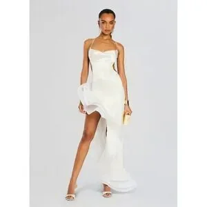 Elegant and dramatic, the Retrofête Kaitlin Dress is designed to make a statement. This stunning white gown features a graceful cowl neckline, open back, and a striking high slit that flows into a dramatic ruffled hem. The silhouette is both modern and sophisticated—perfect for bridal events, galas, or formal occasions.
