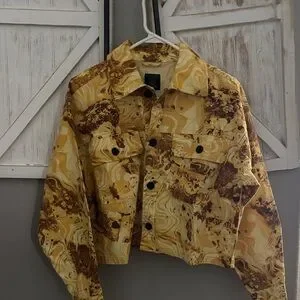 Bold bomber jacket with striking yellow and brown design. Features button closure and front pockets. Ideal for a trendy look.