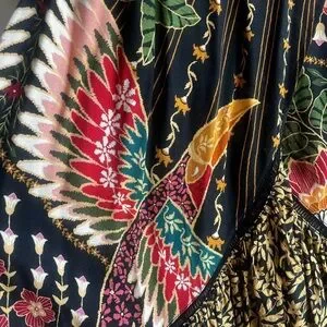 Stunning asymmetrical dress with bold floral patterns. Features a wrap style and vibrant colors. Ideal for making a statement.