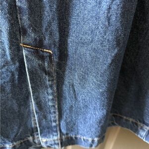 Classic blue denim trench. Features button accents. Double Breasted style. Perfect for casual wear. Full length. NWT. Size M. Tie belt, front slash pockets. Back bottom has vent. Pit to pit measures 21.5” and shoulder to hem is 43”.