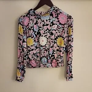 Chic crop top with bold floral design. Features long sleeves and v-neck. Ideal for casual wear.