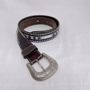 Vintage 90’s Aztec design genuine brown leather belt in good shape! Men size 32-33 waist, sterling silver buckle, made in 1993 with genuine leather. Some minor wear on the inside but that’s it. Cleaned and ready to ship!