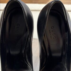 Sleek black leather heels by Gucci. Perfect for elevating any outfit. Timeless design with a modern touch.