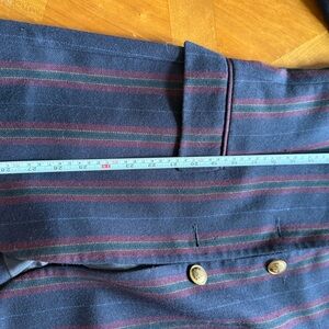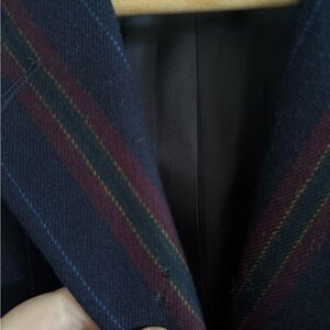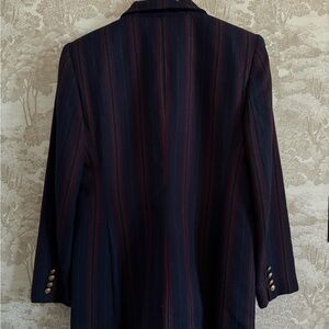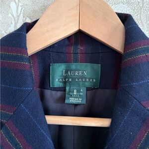 Classic vintage Lauren Ralph Lauren blazer featuring a navy base with burgundy and green stripe, finished with an embroidered RL crest patch and crown detail on the chest pocket. A timeless preppy piece inspired by equestrian and Ivy League tailoring.