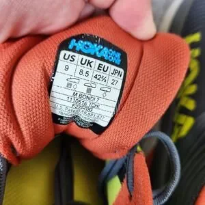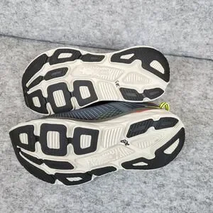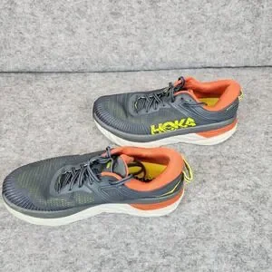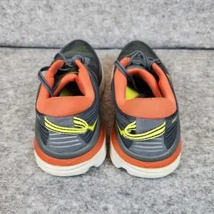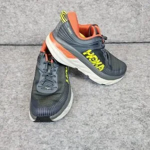Hoka One One Bondi 7 running shoes provide maximum cushioning for a smooth and balanced ride. These performance sneakers feature a breathable mesh upper with a padded collar and a signature thick EVA midsole for superior impact protection. Designed for long-distance road running or everyday comfort, the durable rubber outsole offers excellent traction and longevity. The dark grey and orange colorway with yellow accents adds a vibrant touch to your athletic gear.