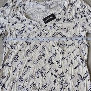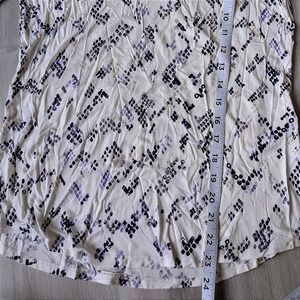 White House Black Market short sleeve top features a sophisticated V-neckline and a striking purple and grey snakeskin-inspired geometric print. Crafted from a soft, lightweight jersey fabric, this versatile tee offers a comfortable fit with a slightly curved hemline for a polished look. Perfect for layering under a blazer for the office or pairing with denim for an elevated casual ensemble.