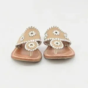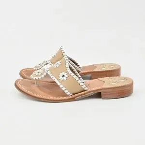 These Jack Rogers Georgica thong sandals showcase the brand's iconic Palm Beach inspired design with smooth tan leather and contrasting white whipstitch trim and rondelle cutouts. Crafted with soft structured leather and a stitched sole with a low stacked heel, they provide a comfortable flat profile perfect for warm weather wear. The neutral color palette makes them easy to pair with summer dresses, linen sets, and casual denim, offering effortless resort inspired style for everyday outings, travel, and vacation wardrobes.