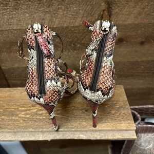 • Heel: High stiletto wrapped in matching snakeskin
