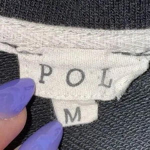 POL Dress. Size medium. This isn't a solid black dress (the full length pictures seem like it's solid black), there is some acid wash. It has buttons down the front. A white and black striped collar and sleeves. It has been worn, but there aren't any notable flaws.