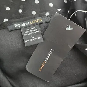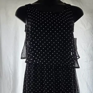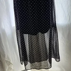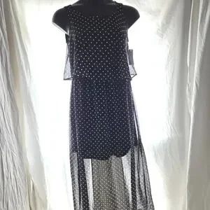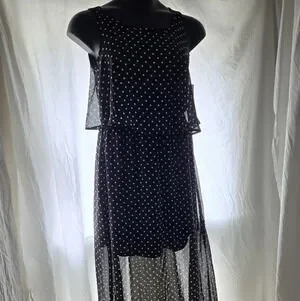 Looks like a skirt and blouse but it's a dress. Built in slip, polka dots, black and white, chiffon material, sleeveless, maxi length flowy, pretty, classy, youthful.