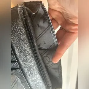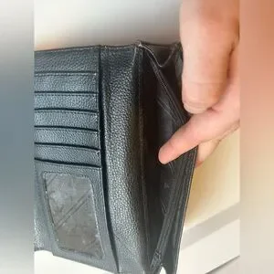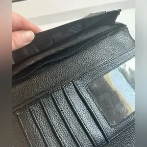 The wallet features a structured envelope design with snap closure and unfolds into a spacious trifold interior with multiple card slots, an ID window, zip pocket, and storage compartments.