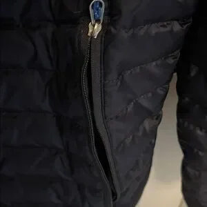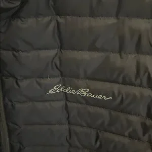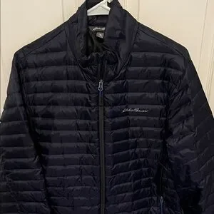 Navy blue puffer jacket by Eddie Bauer. Lightweight and warm. Ideal for cold weather. EB700 weight down fill nylon coat.