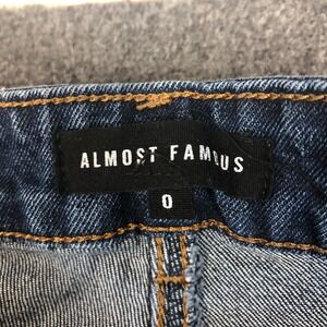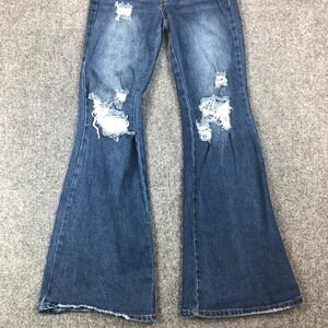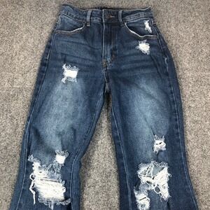 Almost Famous Distressed Flare Jeans Dark Wash High Rise Raw Hem Size 0