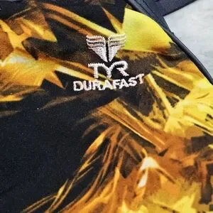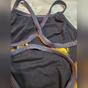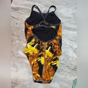 TYR Durafast One-Piece Swimsuit Yellow Abstract Print Crisscros Size 30 S 4/6