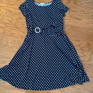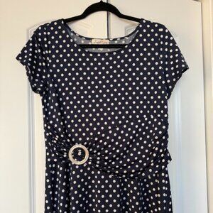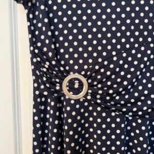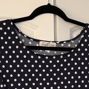 A timeless and flattering polka dot dress from Tradition, featuring a fitted bodice and flowing A-line skirt that creates a beautiful silhouette. The soft navy fabric with white polka dots gives it a vintage-inspired charm, while the waist buckle detail adds a polished, feminine touch.