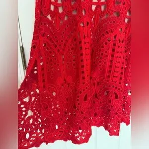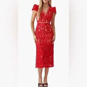 This dress is ART! Absolutely gorgeous, elegant red lace midi dress. Features intricate lace design with a nude slip lining (lining not full length). Intricate lace overlay in a gorgeous, vibrant red. Midi length with a scalloped hem. Fitted waist and feminine silhouette. Short sleeves and V-neckline, full back zip. Perfect for special occasions.