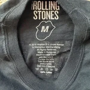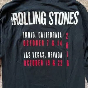 Official band merchandise from the 2016 tour featuring the classic Rolling Stones tongue logo on the front and tour dates on the back.