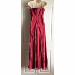 Excellent condition size tag cut off no other noticeable flaws. Details: draped neckline, spaghetti strap, back zipper, lined, light shimmer to the fabric, it’s lightweight, breathable, very on trend right now. I bought this dress for my prom in 2001. Used only once. It’s been sitting in storage. Just needs a quick dry clean. It’s either a size 6 or 8 I can’t recall but I listed measurements. There is no stretch. Approximately laying flat: pit 16.5 inches; waist 15 inches; hip 19 inches; length 60 inches. Material: polyester.