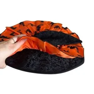 Vibrant orange witch costume with black witch silhouettes. Perfect for Halloween or themed parties. Costume- 2 pieces( dress + hat). Nice design and bright colors. Petticoat has a hoop.